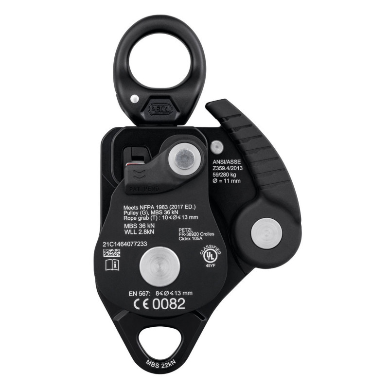 | Zertifizierung(en) | CE EN 567, CE EN 12278 (teilweise), NFPA 2500 Pulley General Use, NFPA 2500 Rope Grab Technical Use, UKCA / Zertifizierung des Systems: ANSI Z359.4 Synthetic Rope Tackle Block (weitere Informationen in der Gebrauchsanweisung) |