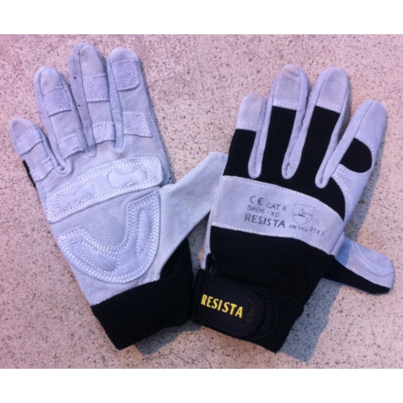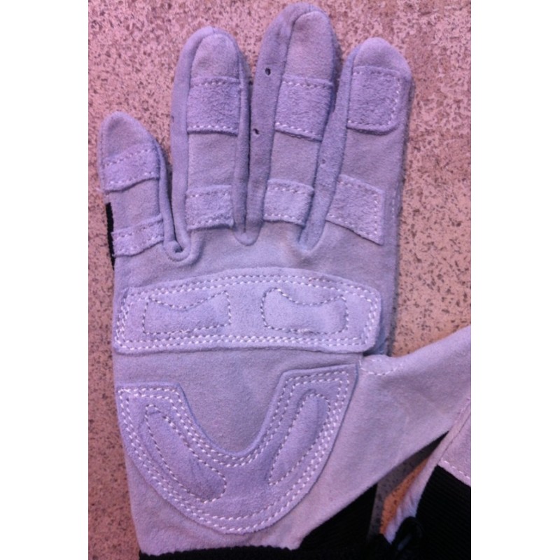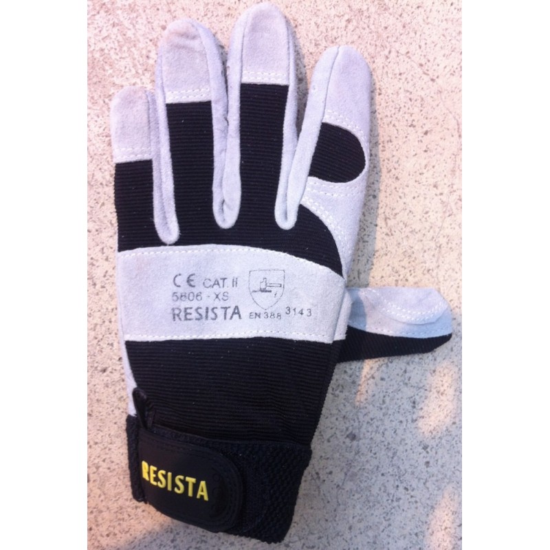 Schutzhandschuhe aus geschmeidigem Rindsspaltleder, Hand- und Fingerflächen versträrkt für optimalen Einsatz am Seil, Lederdicke 1,1 mm, Handrücken aus schwarzem Stretchgewebe, Klettverschluss.